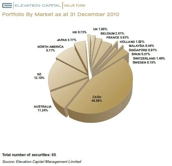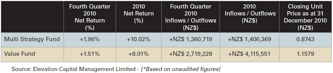 Kirkcaldie & Stains (KRK) & Smiths City Group (SCY) are both significantly undervalued companies that have recently received letters from Elevation Capital requesting each company consider ways to realise value for their respective shareholders. In each case, we are awaiting responses from or meetings with the Board and management executives. In respect of both companies, we now hold the view that we have exhibited enough patience and it is time for some action. Neither company can maintain the status quo indefinitely, and we feel it is our responsibility to make 2011 a year where we step up pressure on Boards in an effort to realise value for allshareholders, but most importantly our unitholders. Please click on the following link to read our letters dated 1 February 2011 to KRK and 30 November 2010 to SCY - www.elevationcapital.co.nz/newsroom/letters. We will keep you updated on our progress. (At the time of writing, KRK accounts for 4.69% of Net Asset Value and SCY accounts for 3.03 % of Net Asset Value. *Note: the Value Fund also holds a position in KRK which accounts for 1.81% Net Asset Value.)