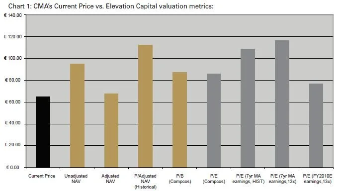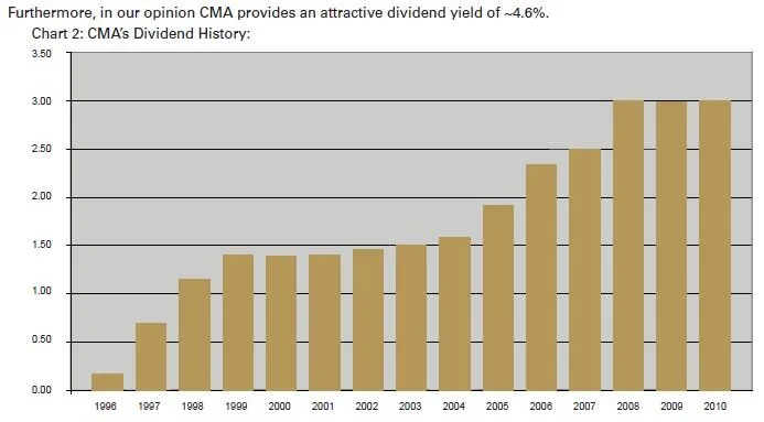 Putting aside the possibilities of a merger with ITA, CMA is very cheap on a number of metrics, including Price-to-Earnings and Price-to-Book. The valuation metrics we used to appraise CMA are detailed below – one can see across all measures with which we appraised CMA that the company is undervalued. (It should be noted our Adjusted NAV is our most conservative valuation metric and in this case it impairs all intangible assets on the balance sheet to zero – an approach we feel provides us with a significant margin of safety.)