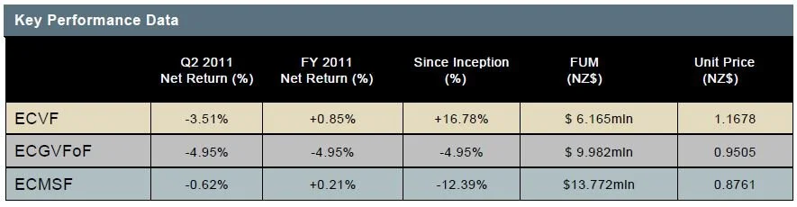 Our Funds delivered negative returns during Q2 2011 primarily due to the NZD appreciating further against the USD (and other currencies). Over the quarter the NZD / USD cross rate rose from 0.7640 – 0.8261 (+8.13%). In July this rallied continued with the currency +6.44% to 0.8793. To provide some comparison to the Fund/s performance the MSCI World Value Index (NZD) declined 8.56% during the quarter and then suffered a further 8.58% decline in July alone. At the end of the quarter, all three of the Elevation Capital funds remain conservatively positioned with net cash balances of 29.7% for ECMSF, 22.6% for ECVF and 10% for ECGVFoF.