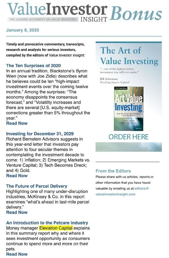Elevation Capital’s research once again featured by Value Investor Insight, a known favourite of Warren Buffett. The prestigious US publication highlighted our summary report on the Petcare Industry, the full report can be found here.